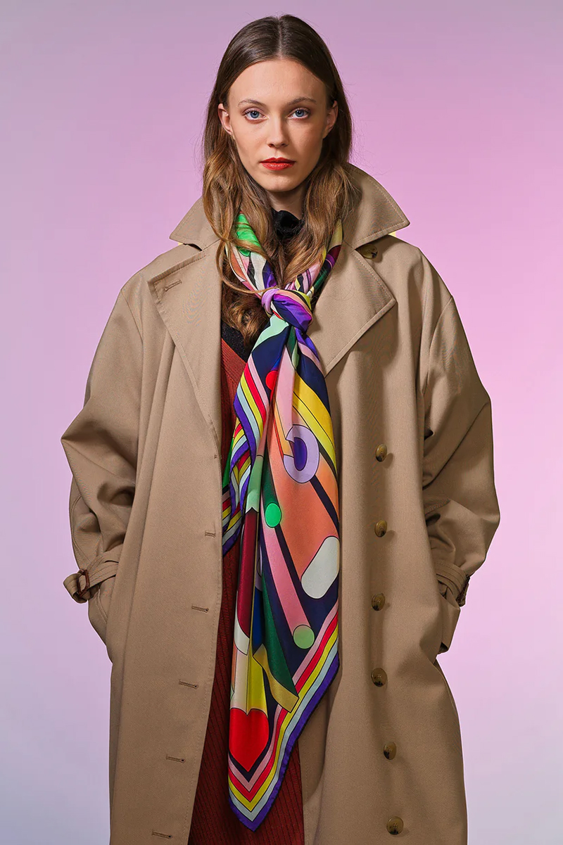 Wunderschön butes , grosses Seidenfoulard. Cool über einen Cap getragen, stielvoll über die Schultern gelegt, businessmässig im Mantel drapiert.