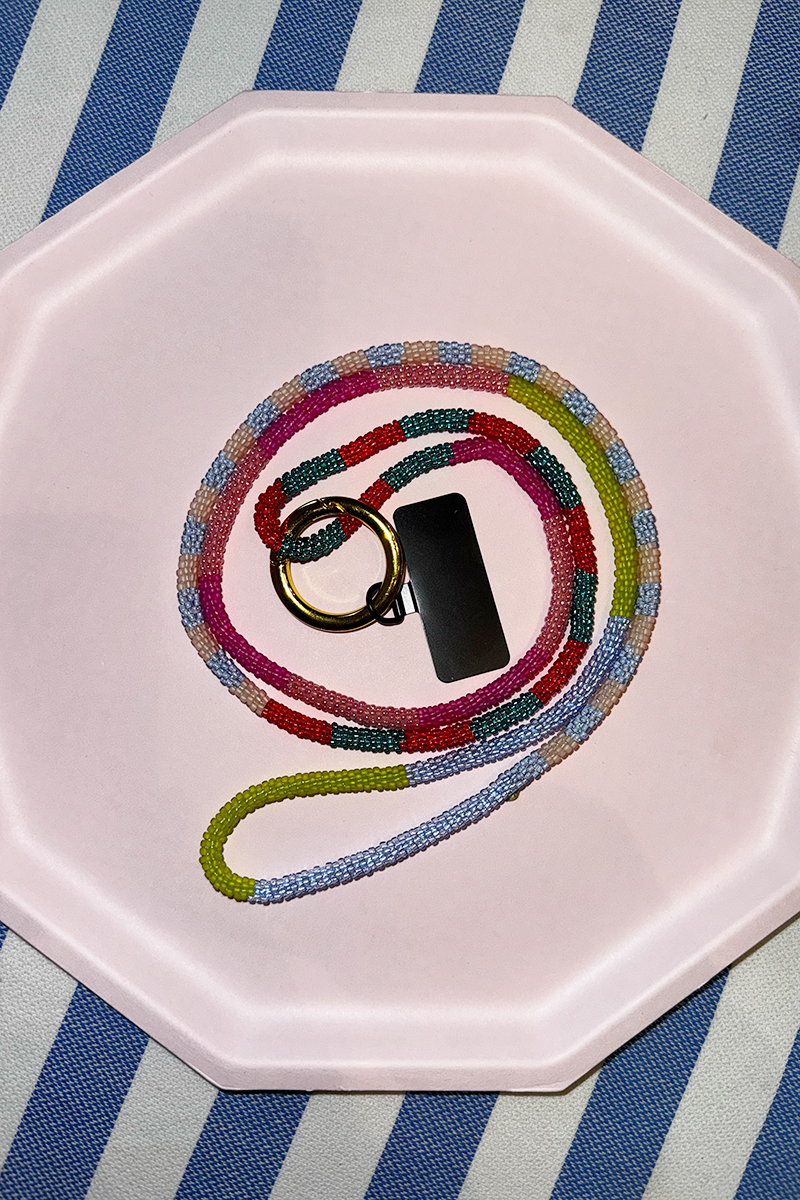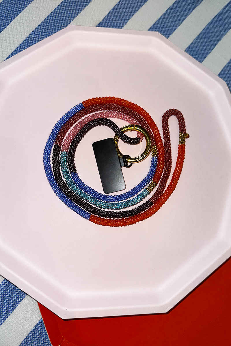 Dieses Schmuckstück kann als Handykette oder Schlüsselband oder einfach so getragen werden. Am Karabinerring, in Gold- oder Silberfarbe erhältlich, kann eine Handyhalterung befestigt werden.
