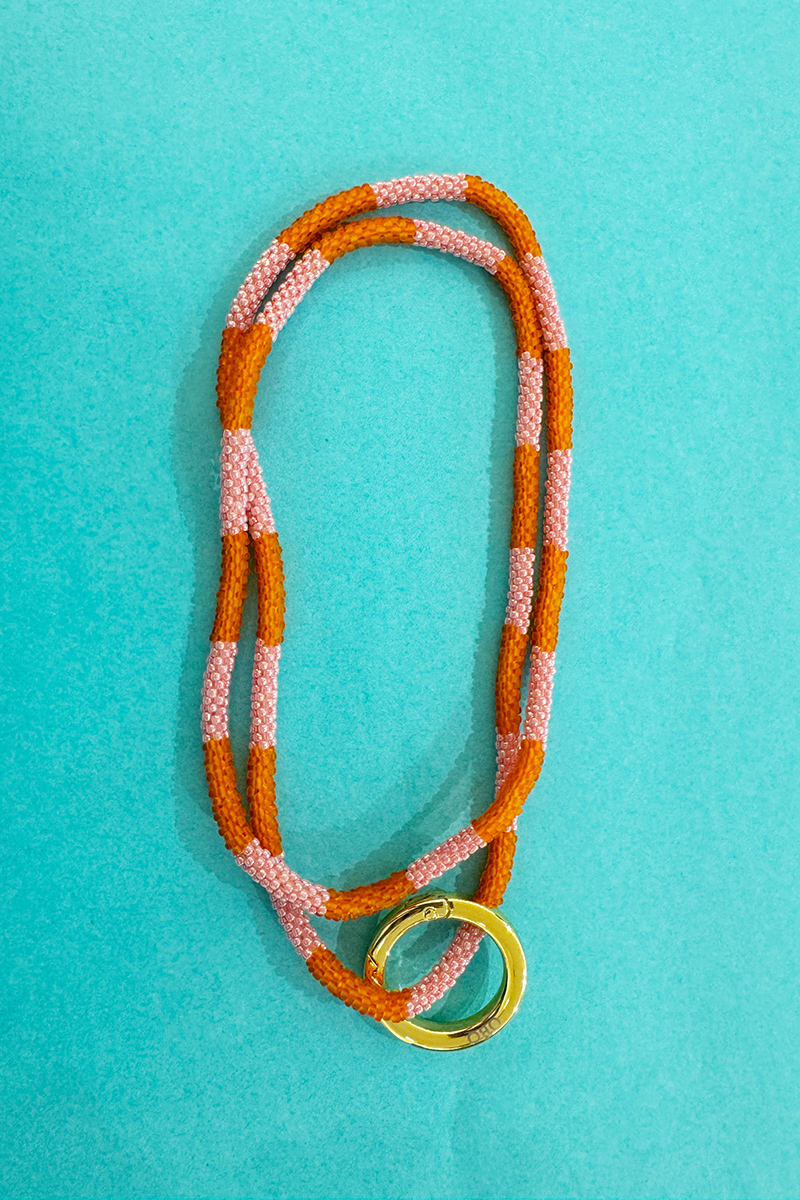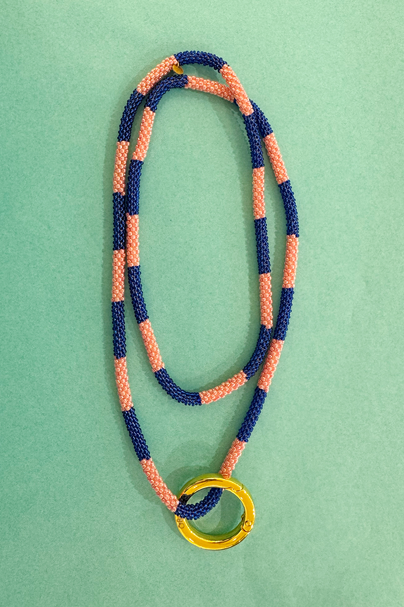 Dieses Schmuckstück kann als Kette oder Schlüsselband getragen werden. Der Karabinerring in Gold- oder Silberfarbe kann entfernt werden. Feel free!