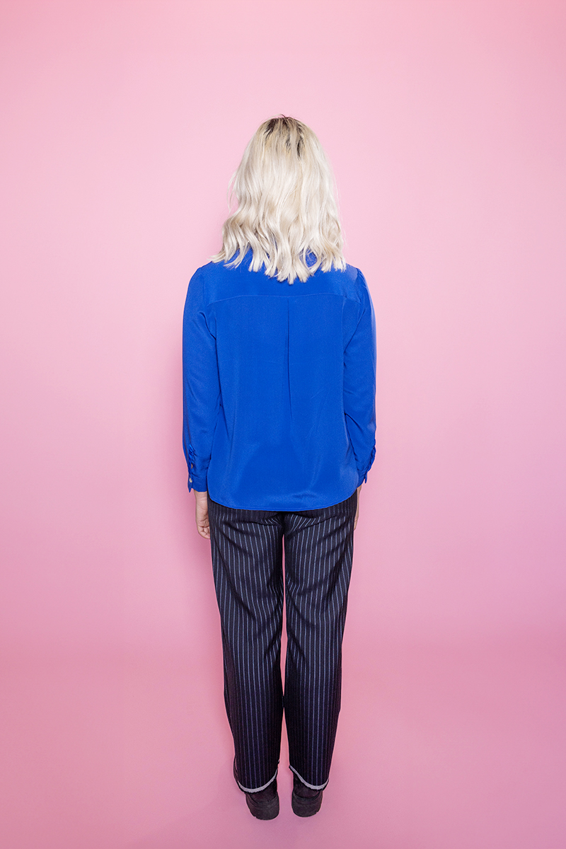 Diese schlichte Bluse mit Stehkragen und aufgenähtem Repsband auf der verdeckten Knopfleiste und am Manschettenschlitz, begeistert durch die feine Seide und die schönen Farben. Die Repsbandfarbe kann selber dazu kombiniert werden.