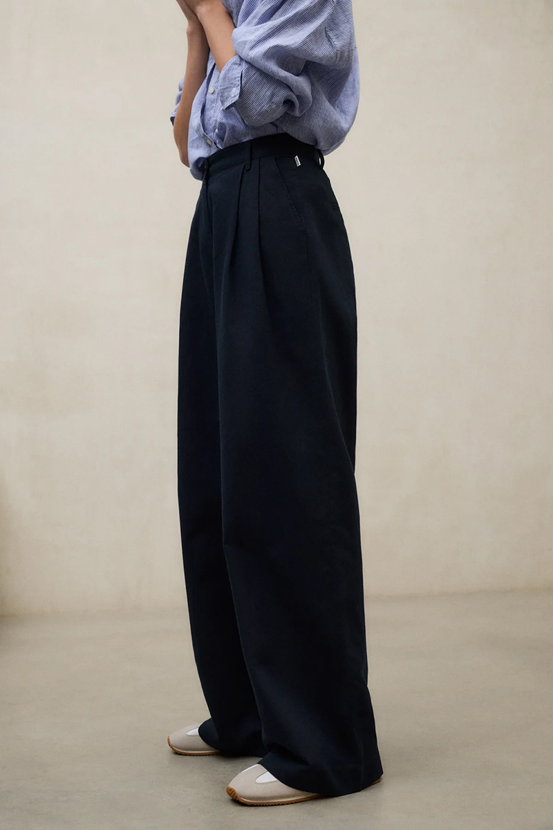 Bundfaltenhose, hoch geschnitten, figurbetont, weite Beine, leichter Stoff.