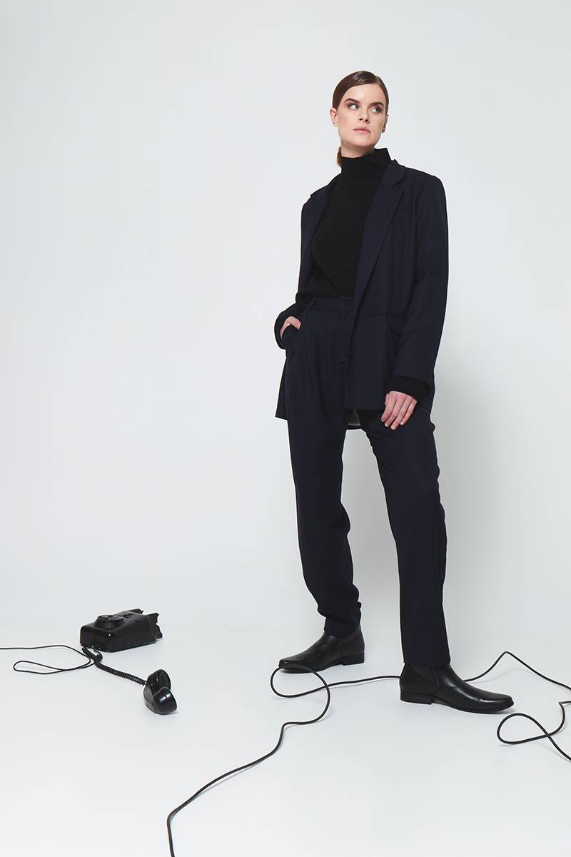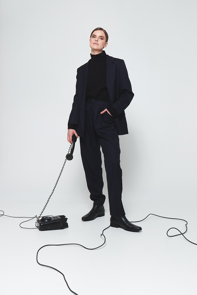Der fallende Wollstoff macht diese Bundfaltenhose zusammen mit dem passenden, androgynen Blazer, zum eleganten Anzug.