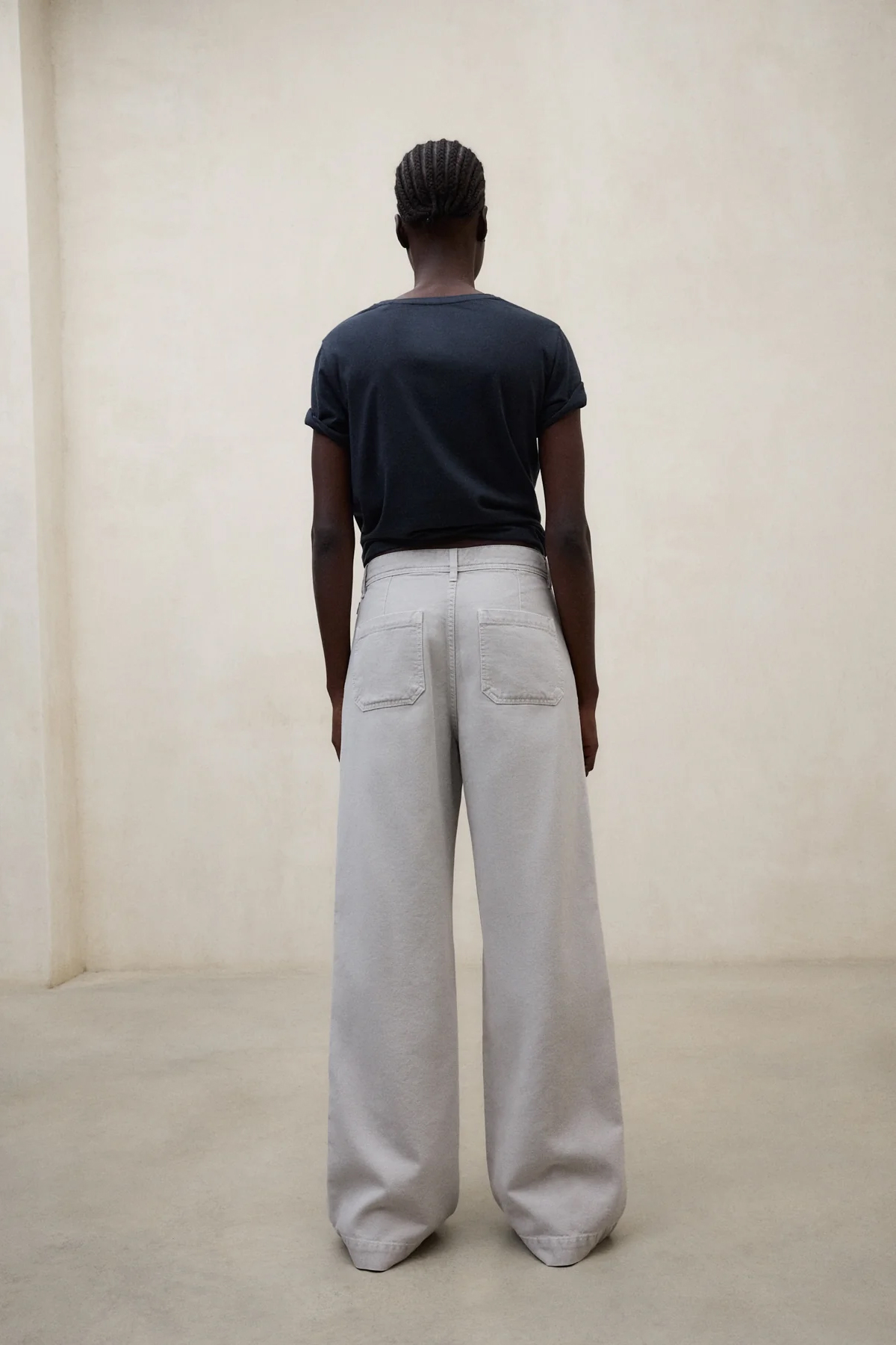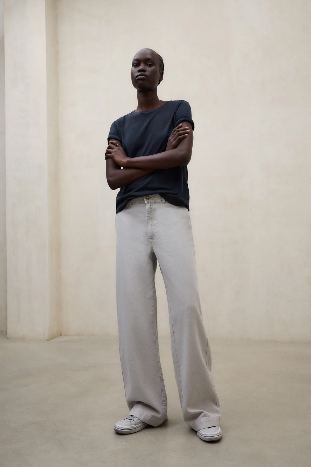 Diese Hose sitzt hoch, ist superweich und mit natürlichen Pigmenten stückgefärbt. Zwei aufgesetzte Taschen hinten, weite Beine, vorne seitliche Taschen, schliesst mit Reissverschluss und Knopf.