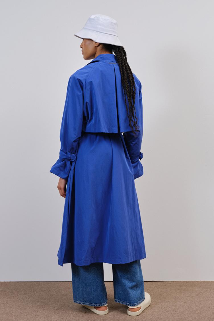 Kalvi ist wasserdicht, wasserabweisend, mit samtigem touch und ein Fashion-Statement. Er ist gerade und oversize geschnitten und kommt in einem leuchtenden blau daher. Kalvi besticht durch die Acht-Knopf-Silhouette, die seitlichen Eingrifftaschen, die weitenverstellbaren Ärmel, den breiten Gürtel, durch die Länge und die hohen seitlichen Gehschlitze. In diesem Trenchcoat bleibst du trocken und ziehst die Blicke garantiert auf dich.