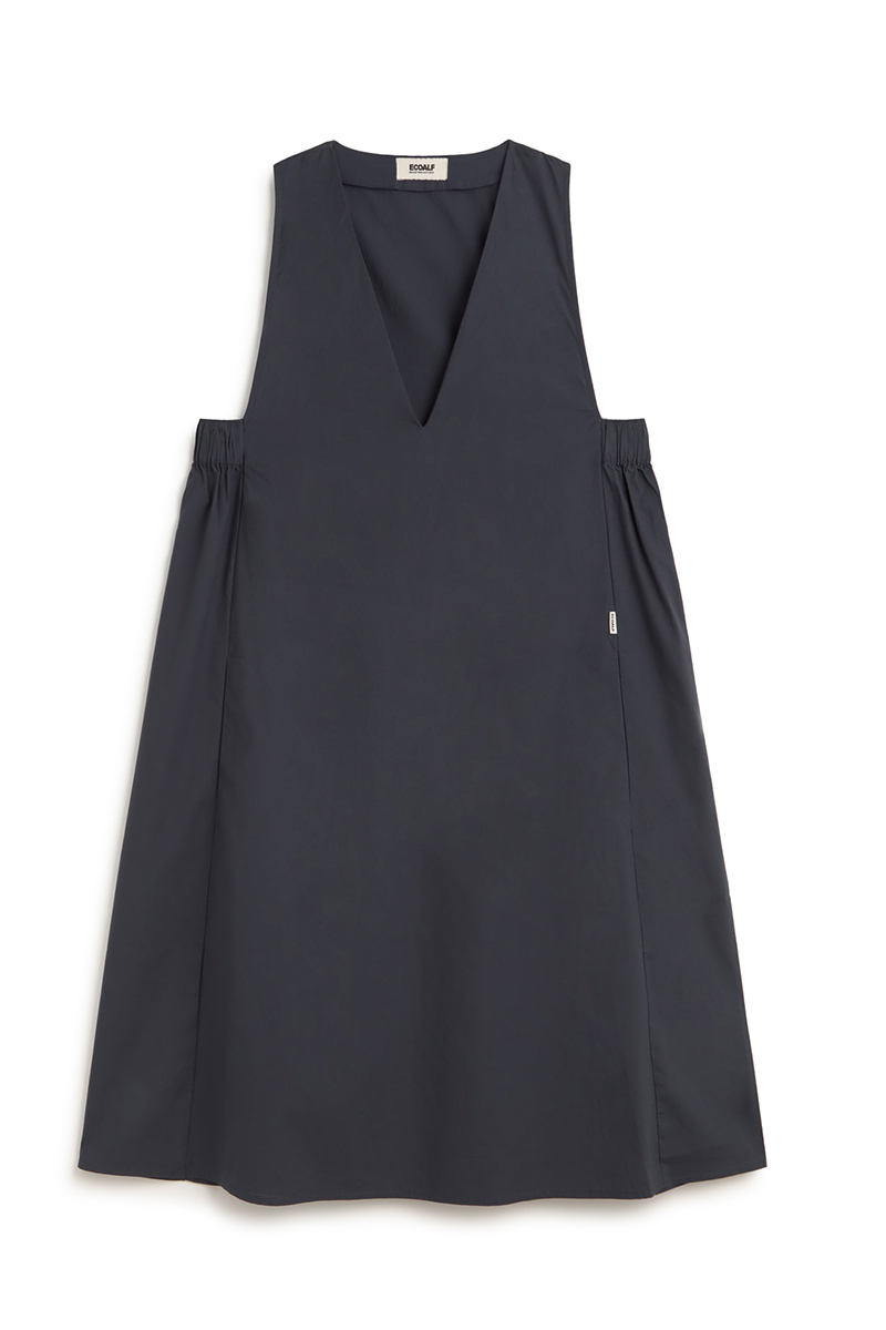 Ein schlichtes, ärmelloses V-Ausschnitt Kleid. Form verleihen die Raffungen seitlich. Leicht, elegant und zeitlos chic.