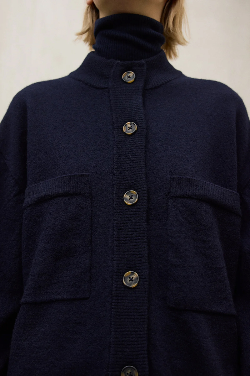 Eine gestrickte Jacke aus gewaschener Wolle, mit geripptem Kragen, Knöpfen und zwei aufgesetzten Brusttaschen. Elegant, warm und zeitlos minimalistisch.