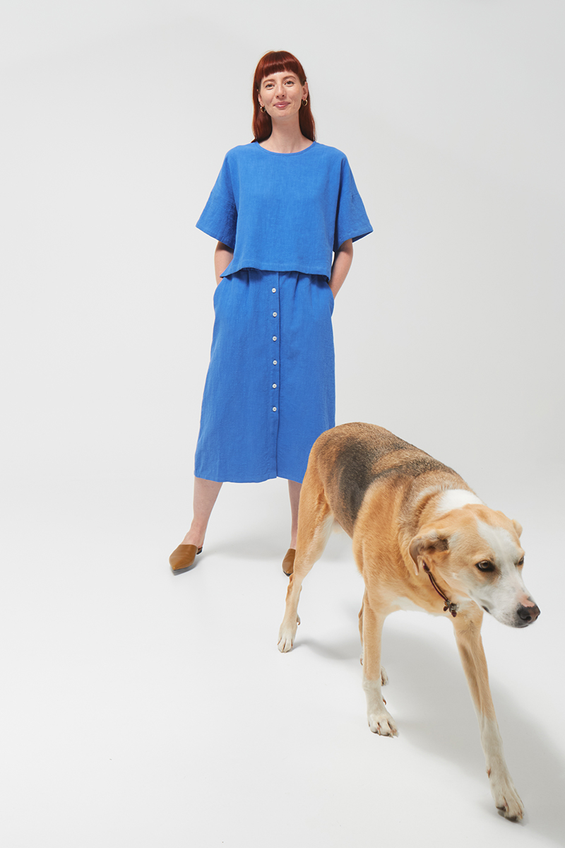 Ein gerade geschnittener Jupe mit zwei seitlichen Taschen und einem Gummizug im Bund. Wadenlang, schliesst er Vorne mittig mit einer durchgehenden Knopfleiste. Das Material Rami, auch bekannt als Chinaleinen, ist eine asiatische Nesselart. Durch das Waschen wird das Naturmaterial weicher und erhält mehr Glanz.